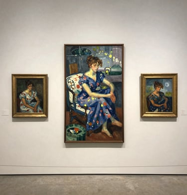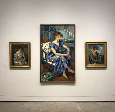 A softly lit corner of galerie homa'rt showcasing a vibrant contemporary painting beside a delicate sculpture.